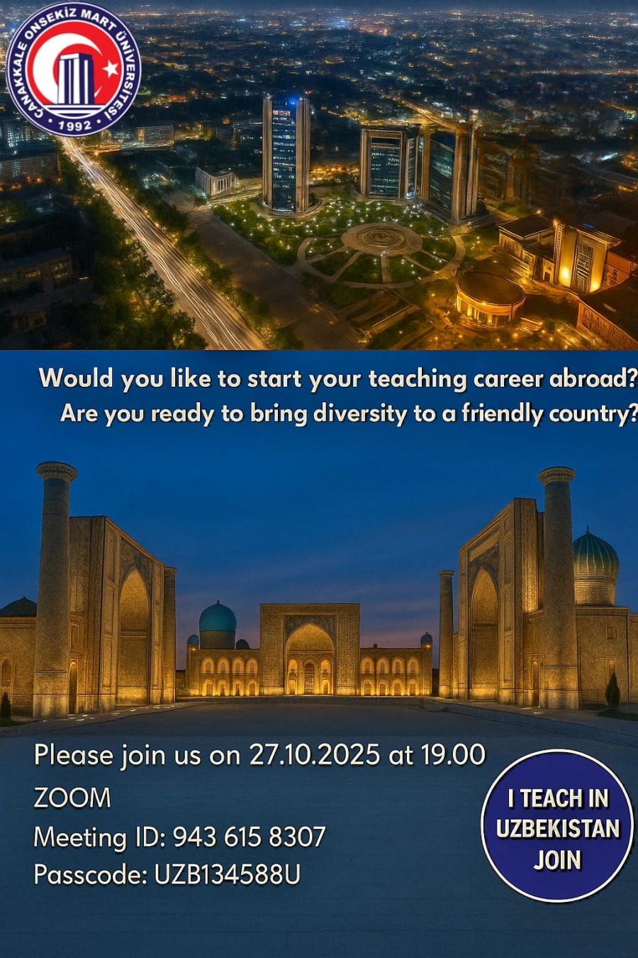 As Çanakkale Onsekiz Mart University, we are organizing an online information session to introduce teaching opportunities in Uzbekistan and support our students in shaping their global career paths.